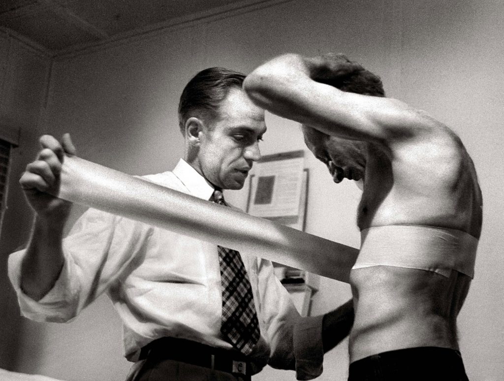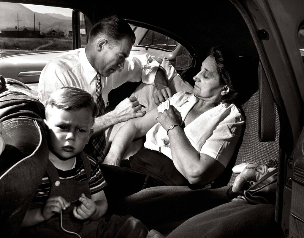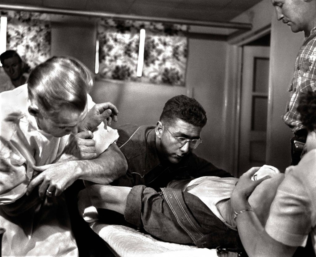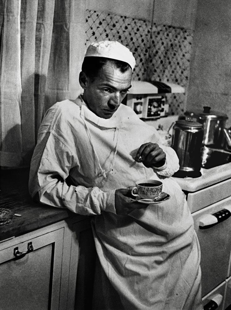 “The walk to Paradise garden” 1946, Photography W. Eugene SmithDr. Ceriani holds 11-month-old son Gary as his wife, Bernetha, steadies 3-year-old Phillip on a fence while watching a parade. Though they’d been married for four years at the time Smith was profiling the doctor, Mrs. Ceriani still struggled with the unpredictability of her husband’s schedule.After finishing a surgery that lasted until 2 AM, Dr. Ceriani stands exhausted in the hospital kitchen with a cup of coffee and a cigarette. «The nurses,» LIFE noted, «constantly admonish him to relax and rest, but because they are well aware that he cannot, they keep a potful of fresh coffee simmering for him at all hours.»Not published in LIFE. Dr. Ernest Ceriani on his way to a house call in foul weather, Kremmling, Colo., 1948.Ralph Pickering holds his 5-week-old baby while waiting to be Dr. Ceriani’s first patient of the day. Pickering, a horseback guide to tourists coming to see the majestic Rocky Mountains, traveled from an outlying ranch to reach the doctor’s office.